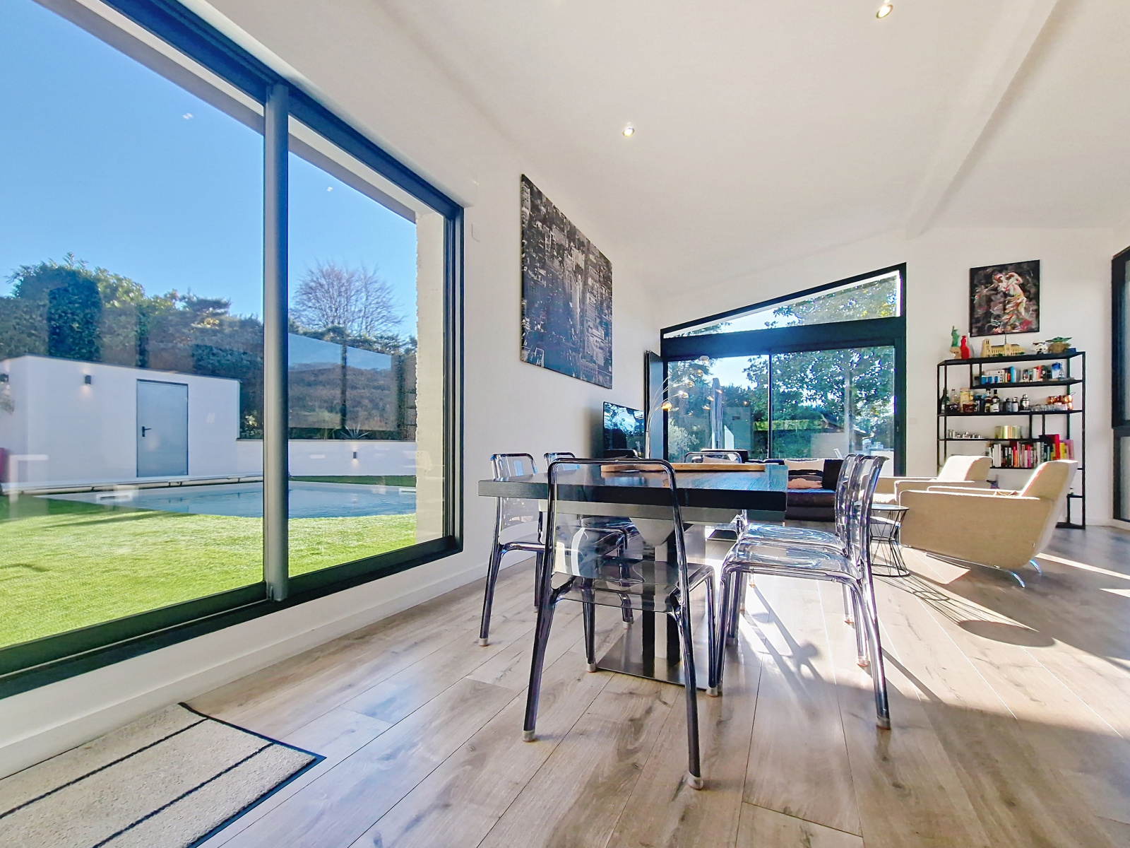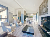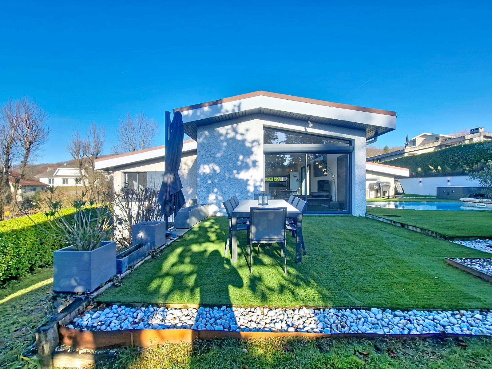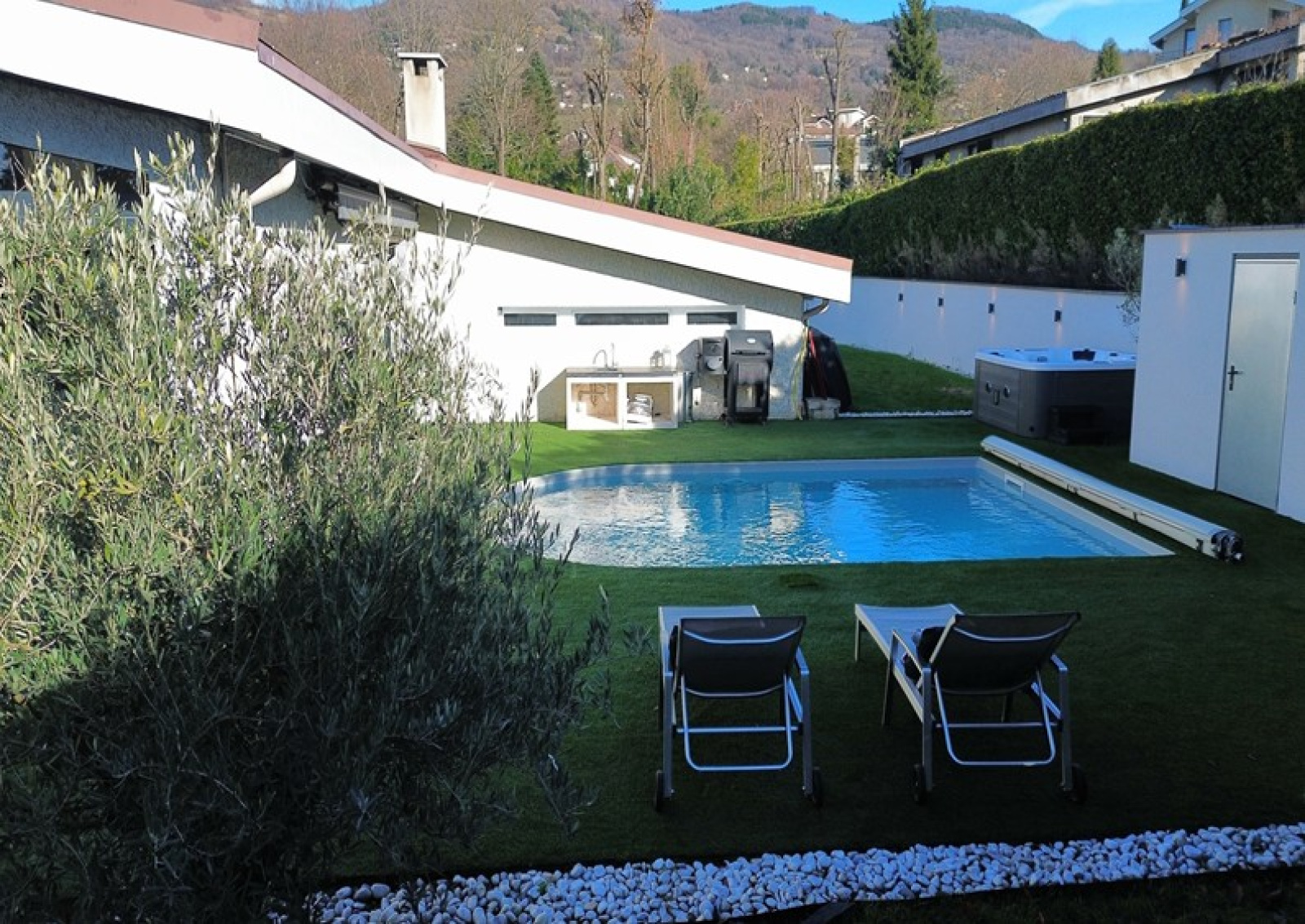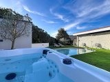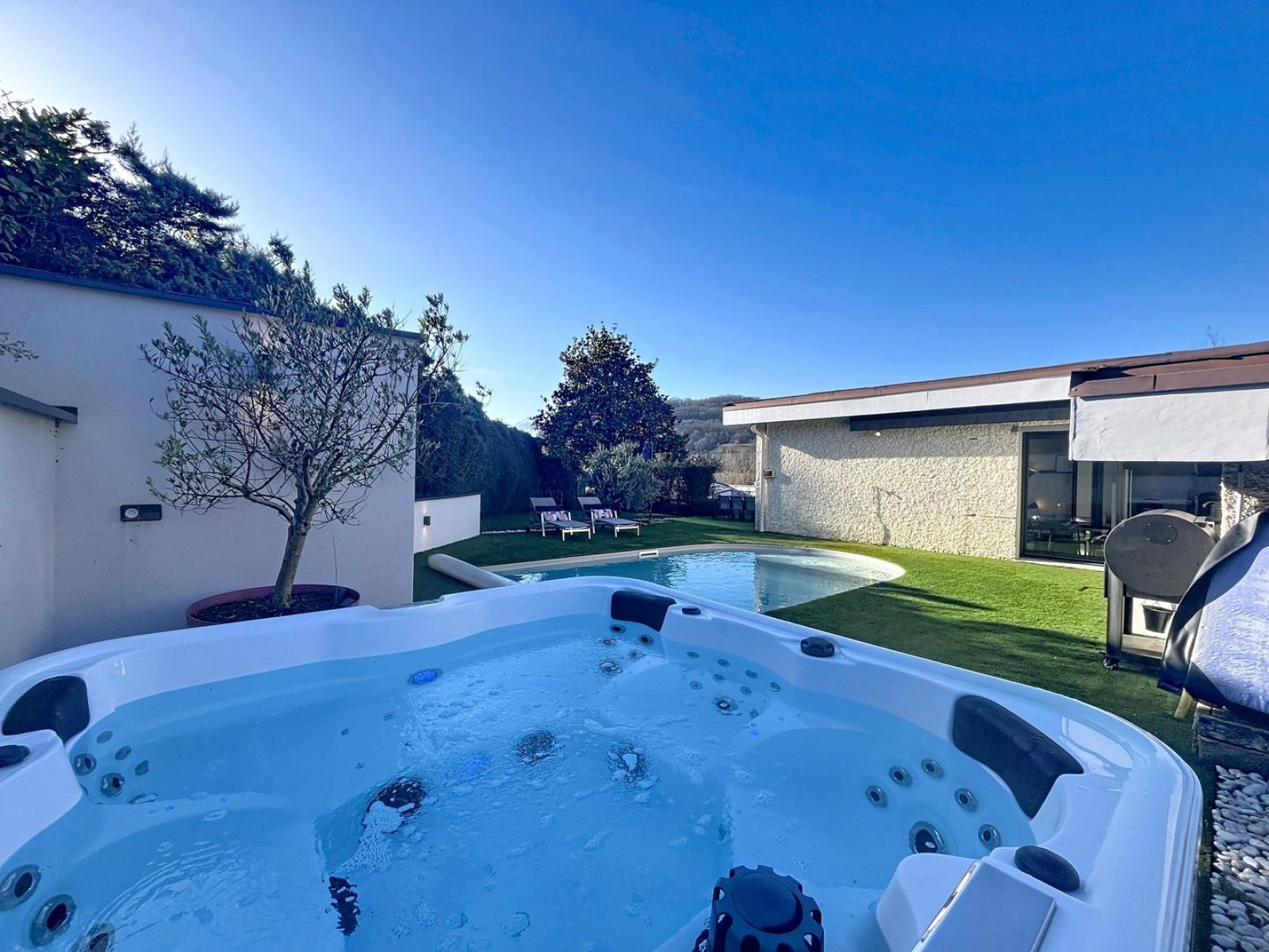 La pièce de vie lumineuse et climatisée, avec salon et salle à manger largement vitrés, s’ouvre sur deux espaces extérieurs intimistes : un espace détente avec piscine et jacuzzi, et un jardin confidentiel avec terrasse, le tout offrant une vue dégagée sur la campagne et les montagnes. La cuisine haut de gamme ouverte, parfaitement intégrée, prolonge l’espace de vie.