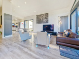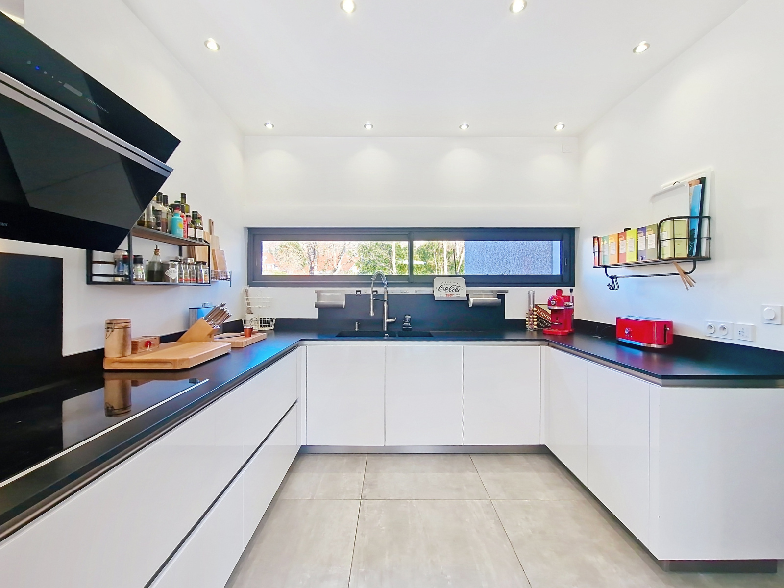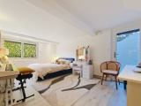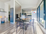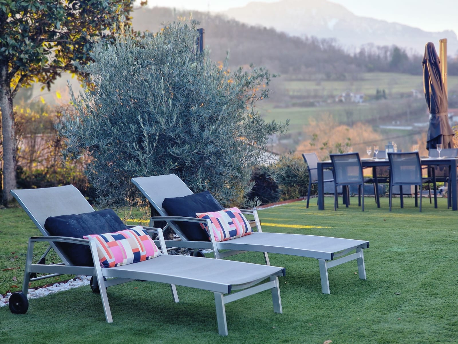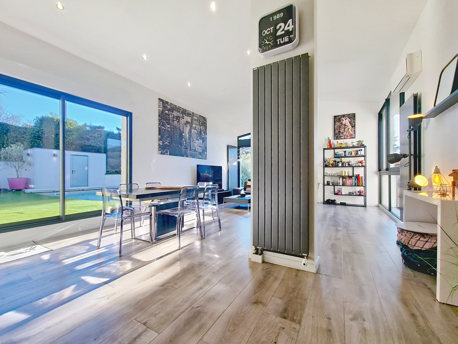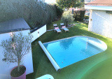 La pièce de vie lumineuse et climatisée, avec salon et salle à manger largement vitrés, s’ouvre sur deux espaces extérieurs intimistes : un espace détente avec piscine et jacuzzi, et un jardin confidentiel avec terrasse, le tout offrant une vue dégagée sur la campagne et les montagnes. La cuisine haut de gamme ouverte, parfaitement intégrée, prolonge l’espace de vie.