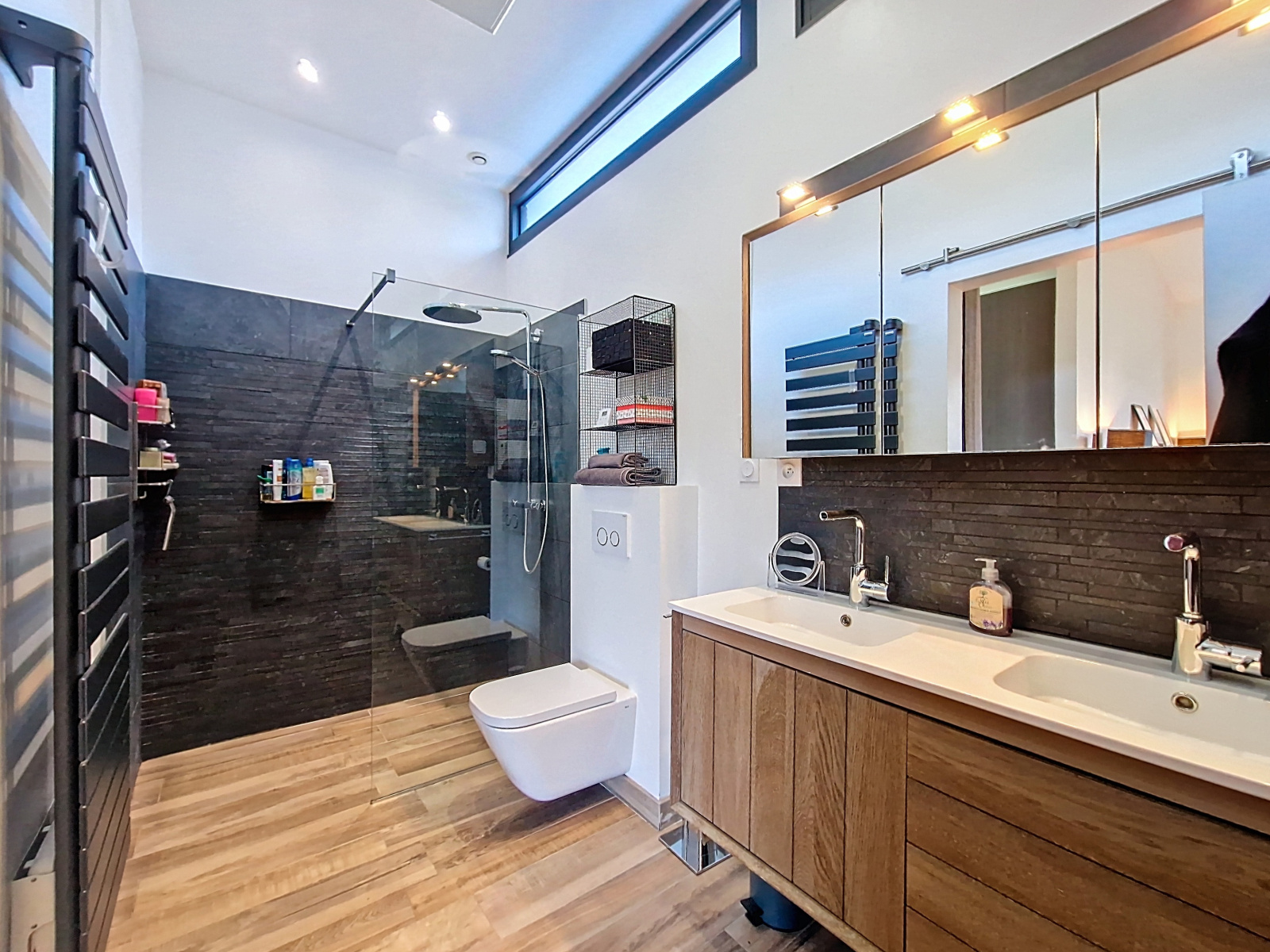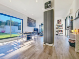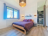 De plain-pied, la maison dispose également d’une suite parentale avec wc, salle de bain (douche et baignoire) et grand dressing réalisé sur mesure. Présence sur ce niveau d’une seconde chambre, d’une salle d’eau, d’un wc ainsi que d’un accès direct à la buanderie, au cellier, à la chaufferie et au garage.